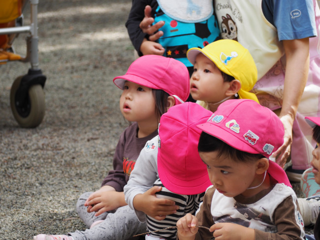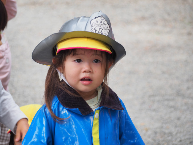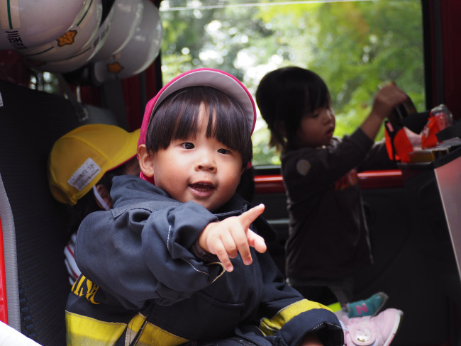 この日は消防訓練でした。間近で見る消防車に圧倒される子どもたち。