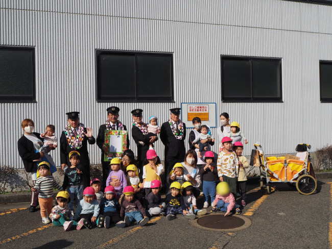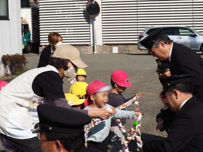 2025.11.17 園だより 勤労感謝の集い この日は勤労感謝の集いでした。みんなで能勢電鉄さんに行き、プレゼントを渡しました!帽子をかぶらせてもらったり、通る電車に手を振ったりして、みんなで集合写真を撮りました! PDFを開く 一覧に戻る
